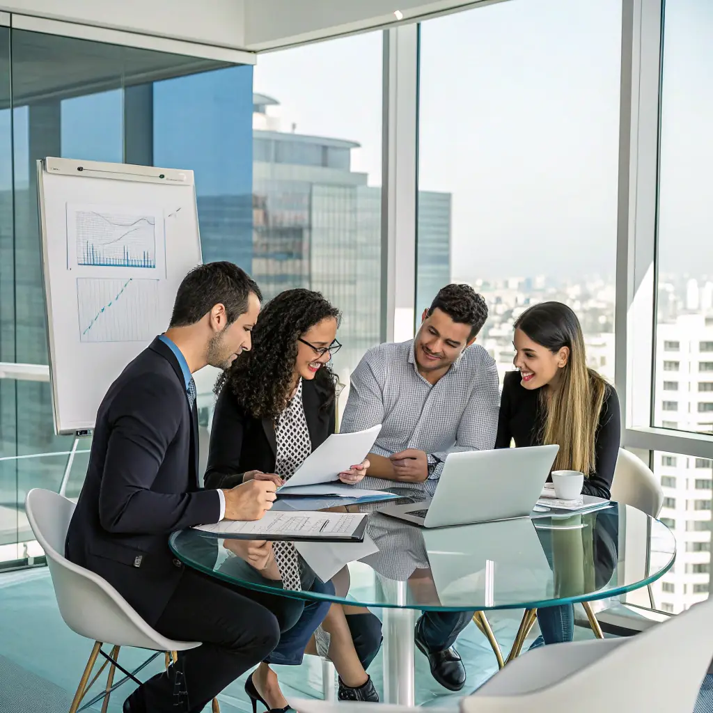 A team of consultants collaborating around a table, discussing findings from a project health check.